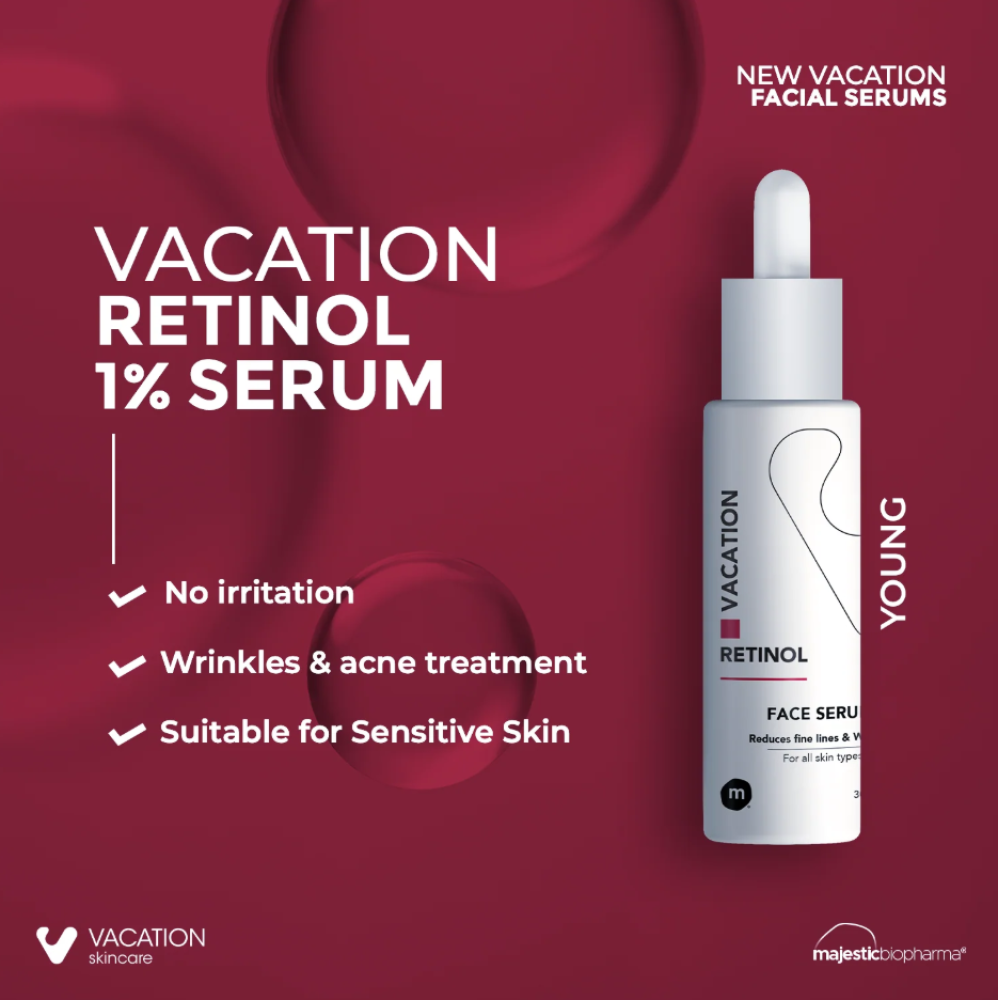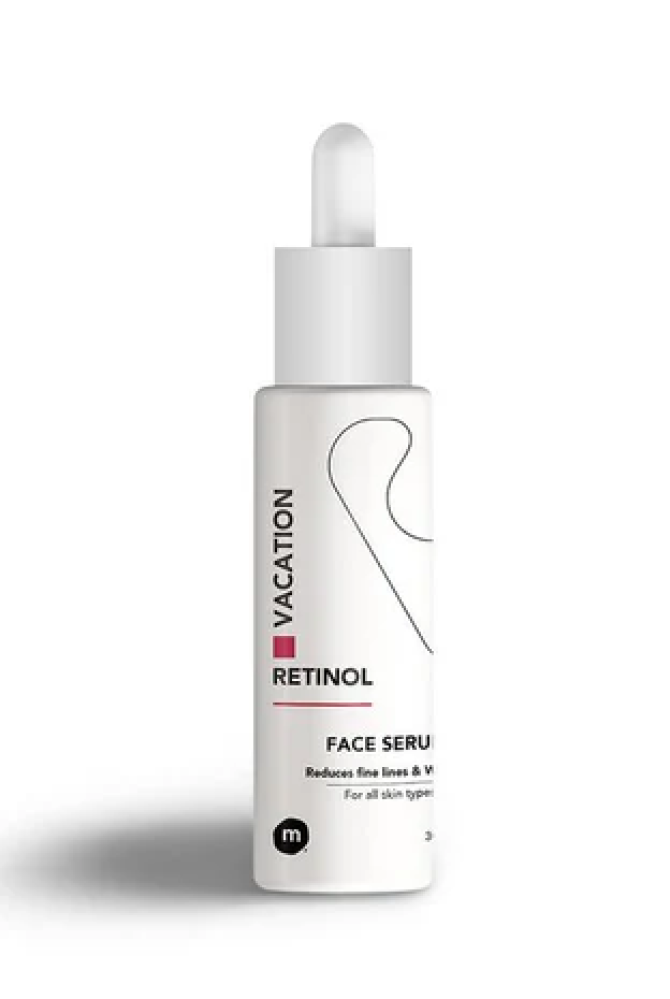 دلّلي بشرتك مع سيروم فيس ريتينول من Vacation – 30 مل، الحل المثالي لمكافحة علامات التقدّم في العمر وتجديد خلايا البشرة. يحتوي على الريتينول النقي المعروف بفعاليته في تقليل التجاعيد والخطوط الدقيقة، مع تعزيز مرونة البشرة ومنحها مظهرًا أكثر إشراقًا وحيوية.